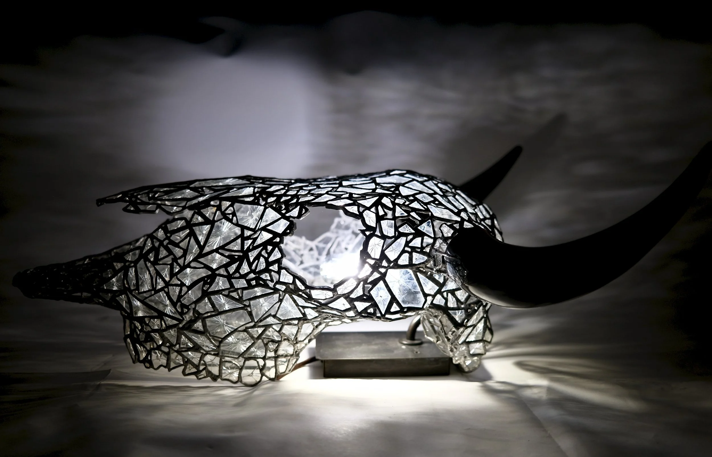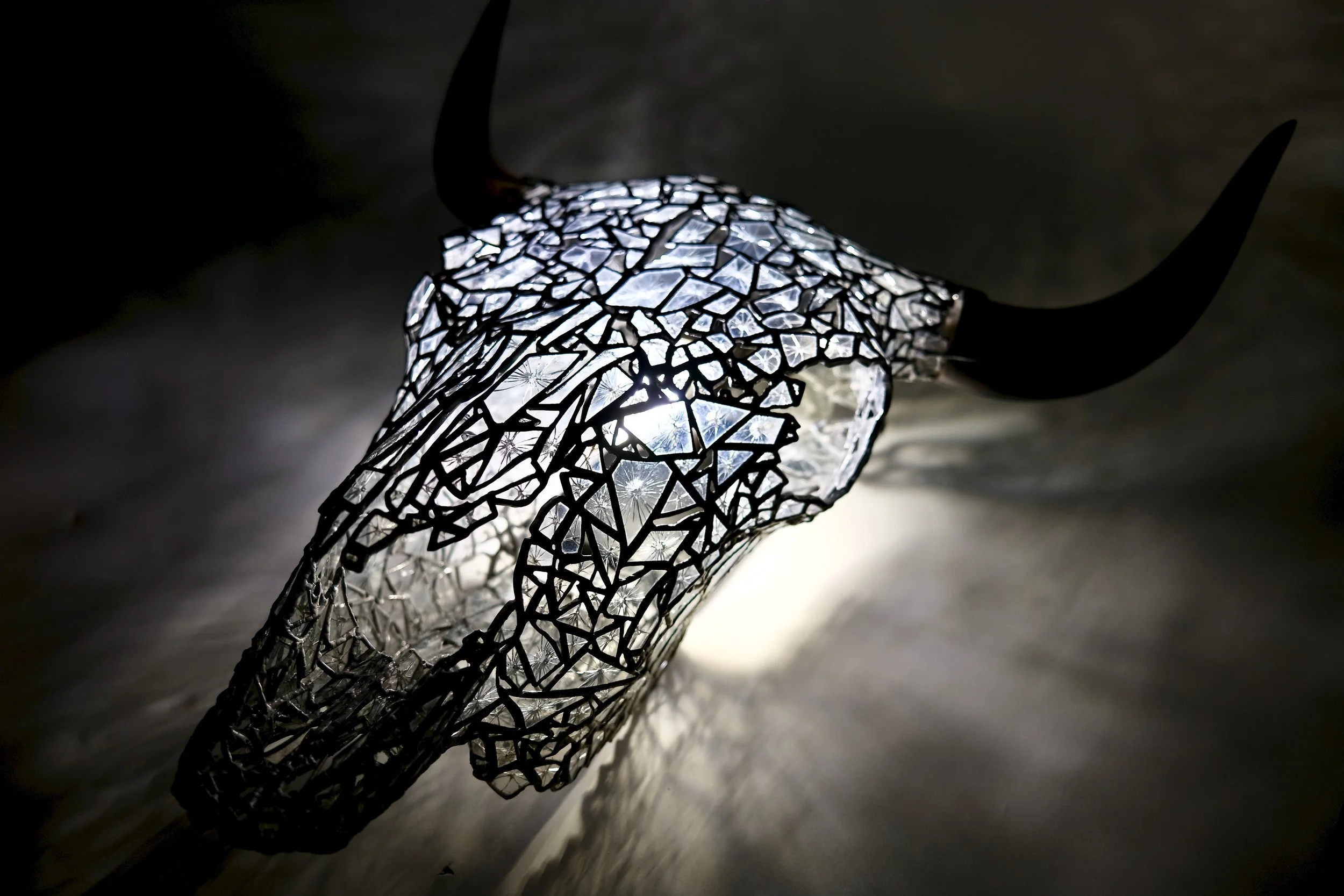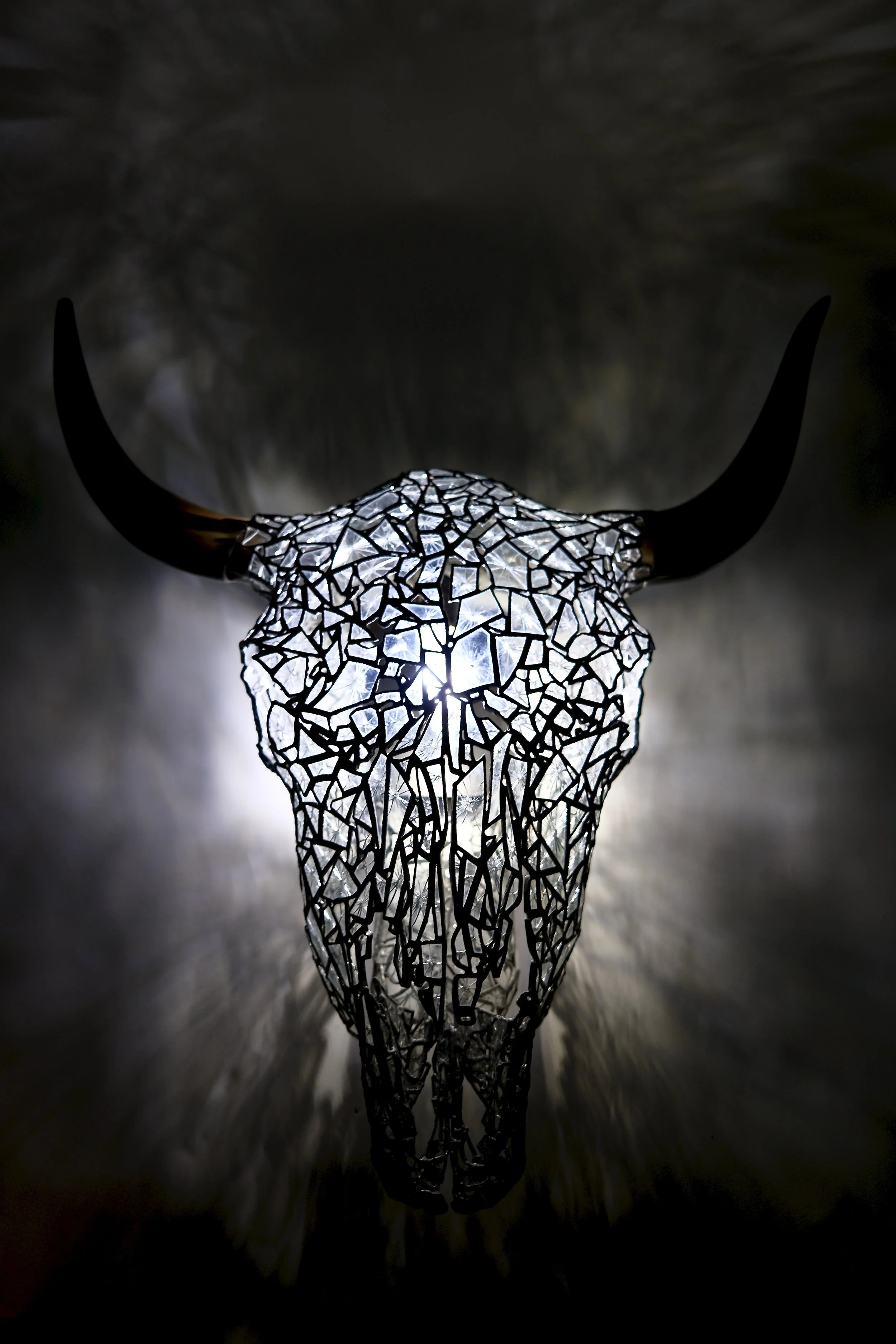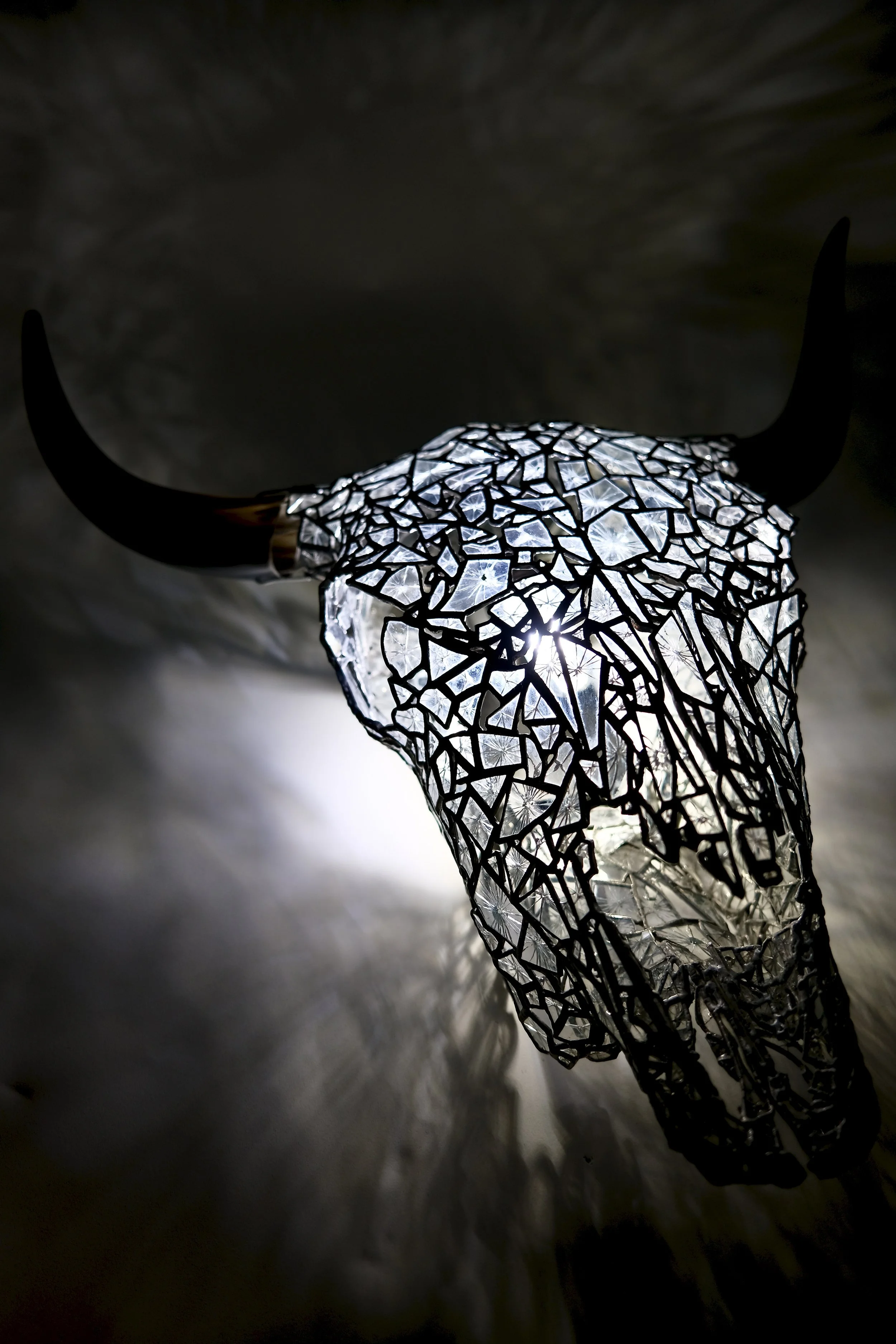 Each Individual piece of glass in this skull was broken by hand to achieve the effect