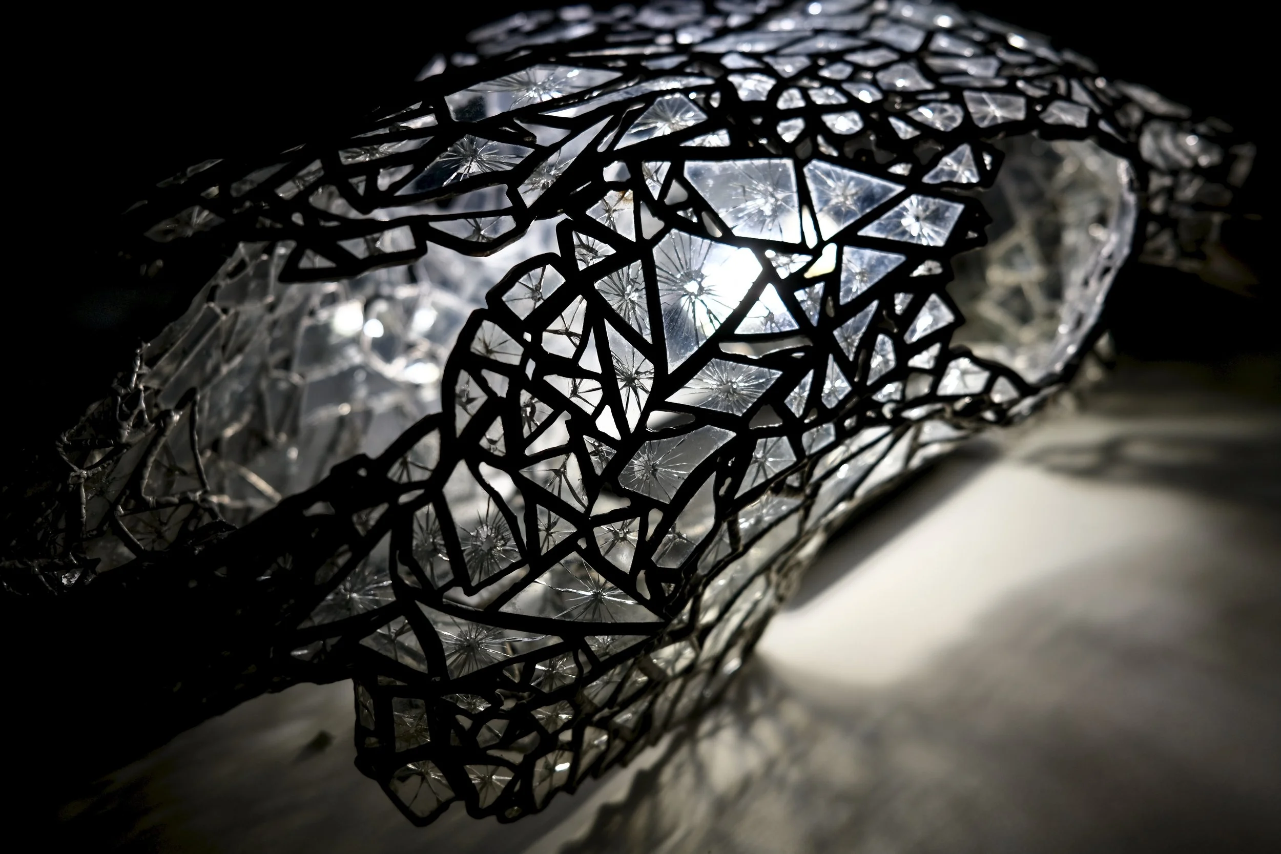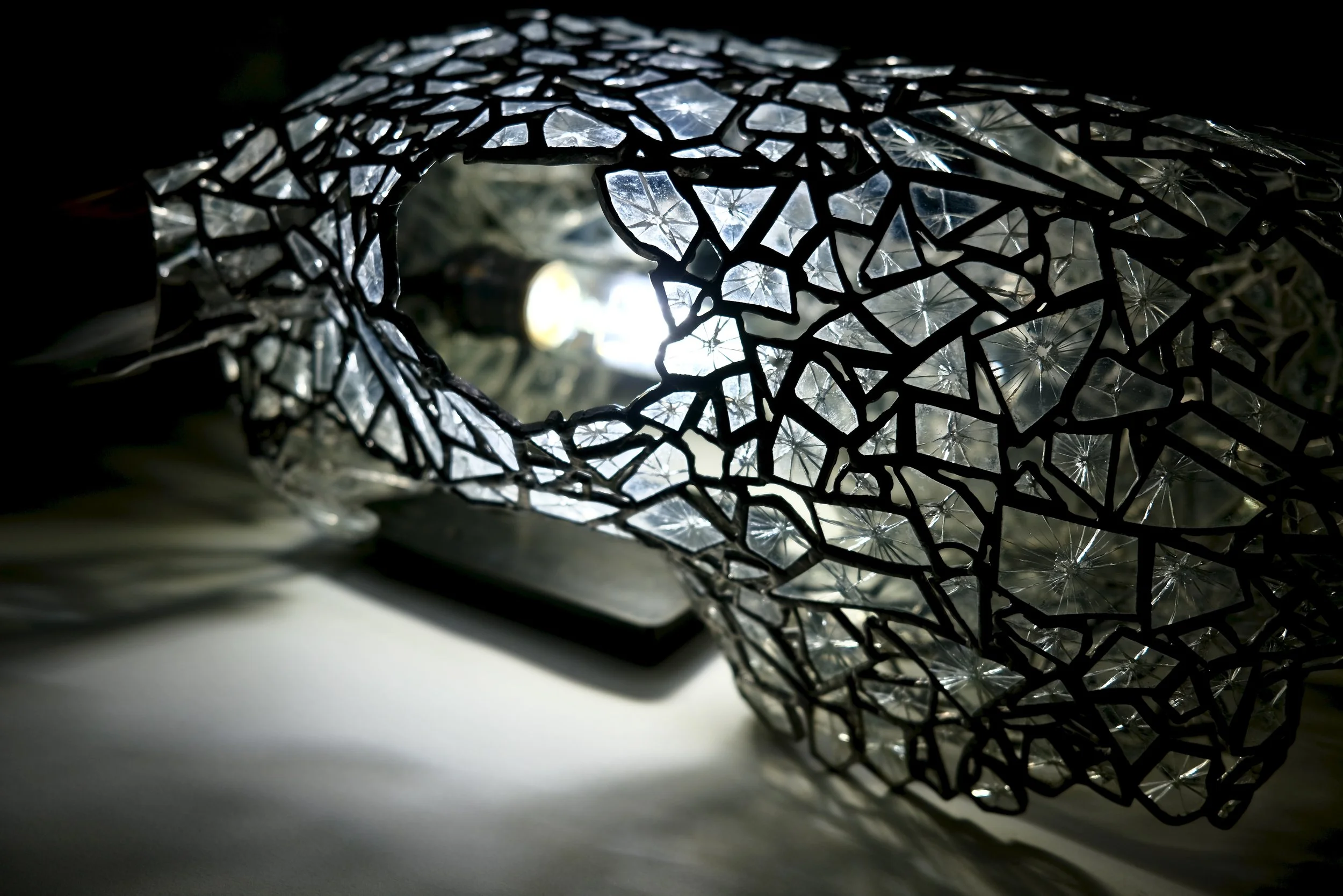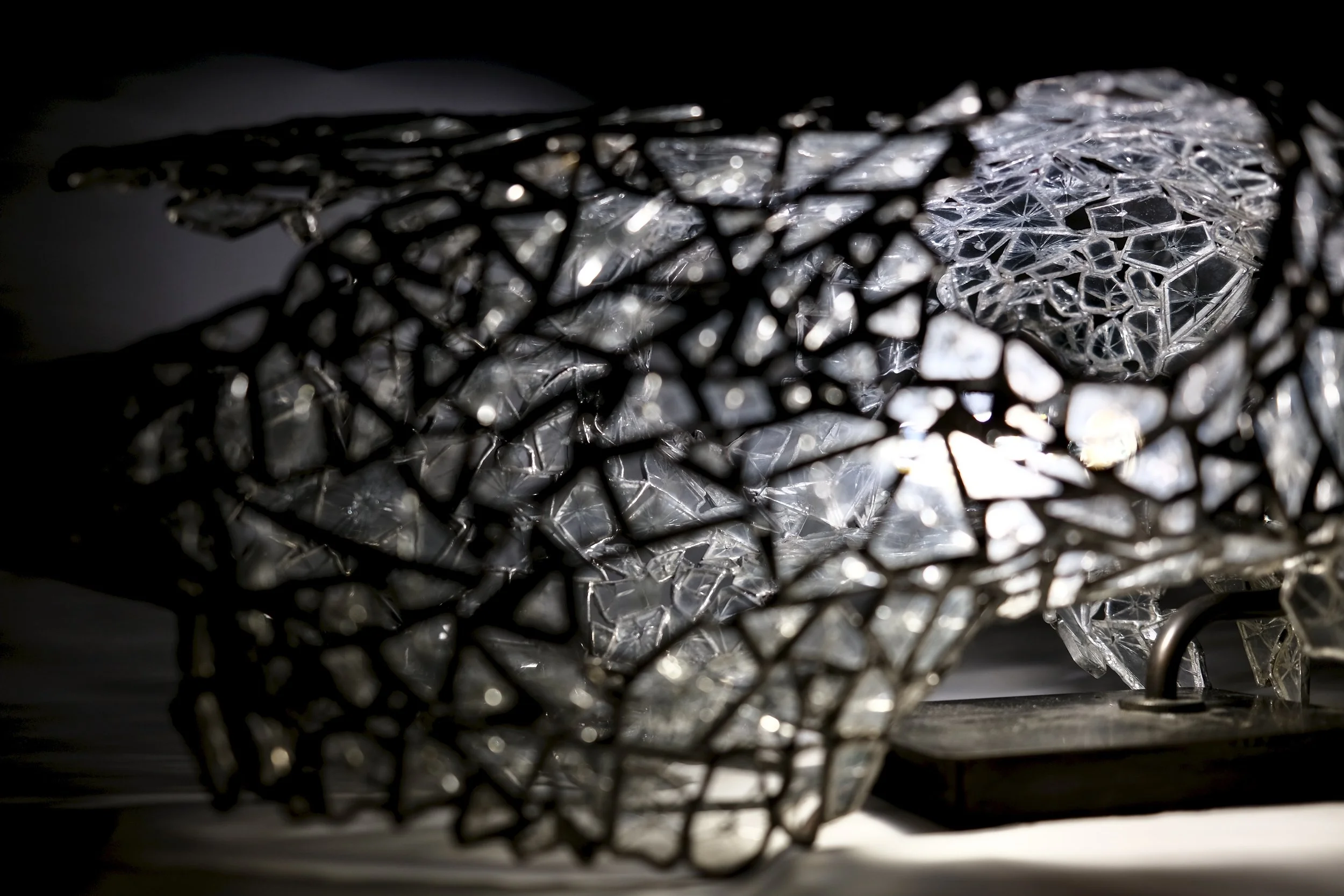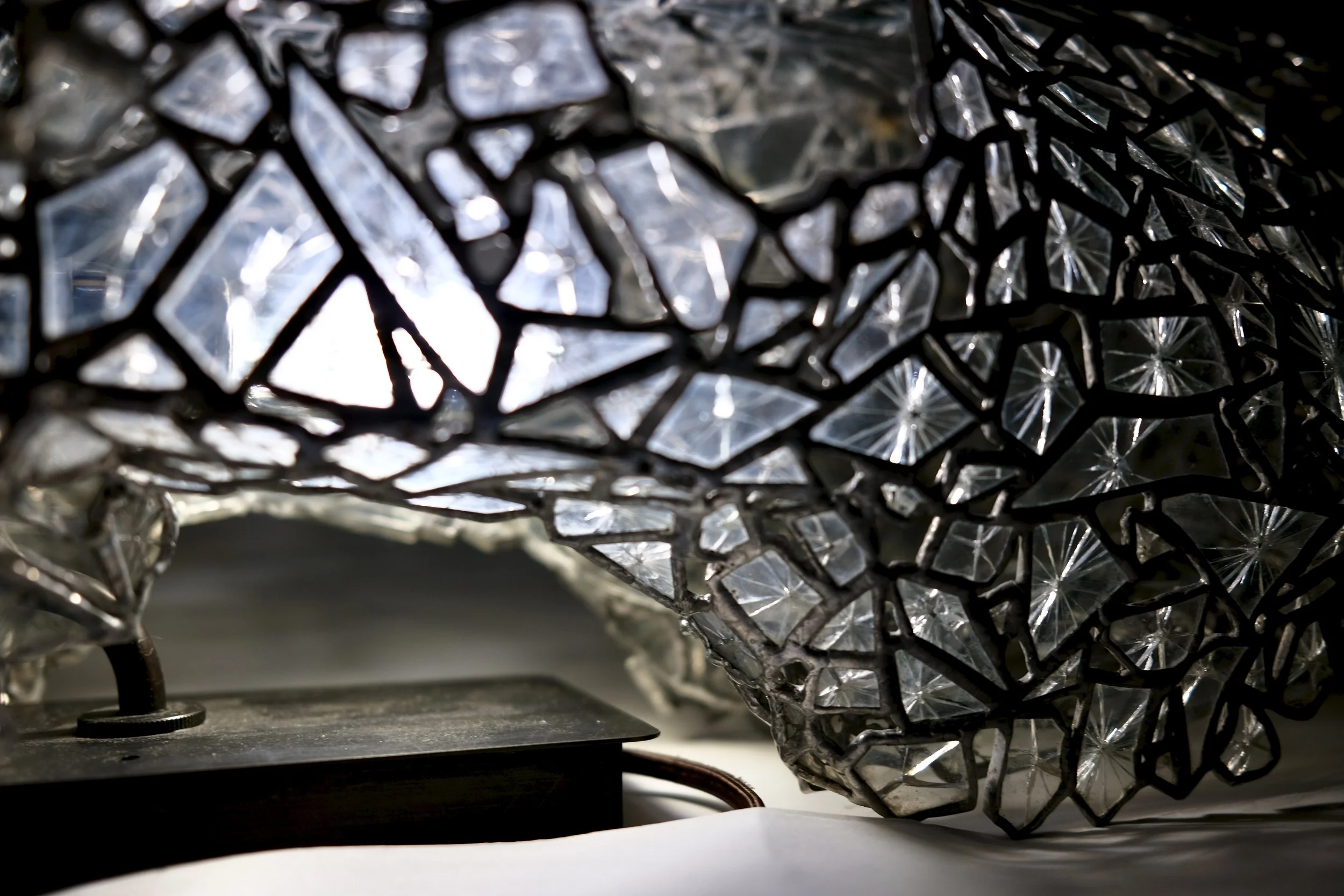 Each Individual piece of glass in this skull was broken by hand to achieve the effect