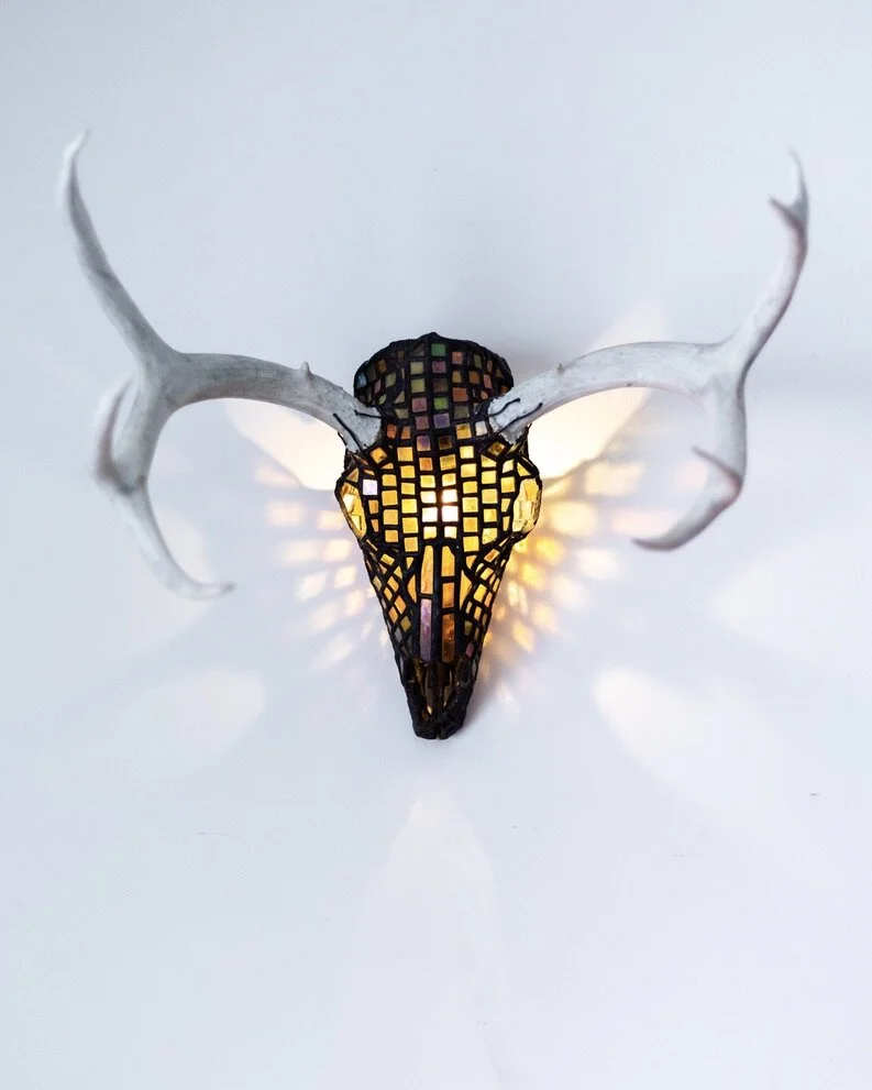 Fragile West - Deer - Monarch View fullsize View fullsize View fullsize View fullsize View fullsize View fullsize 21” x 23” x 17”Glass, copper foil, solder, copper wire, antler